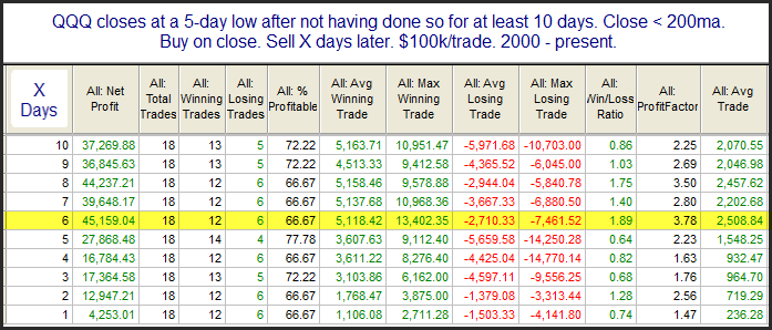 Yesterday I showed a SPY study that examined the 1st 5-day low in over 2 weeks. QQQ triggered its own version on Wednesday. I showed the QQQ version last in the 11/12/10 subscriber letter. There I found that the edge played out favorably below the 200ma but above it the edge was not apparent. QQQ is below the 200ma, so here are the results from that 2010 study.