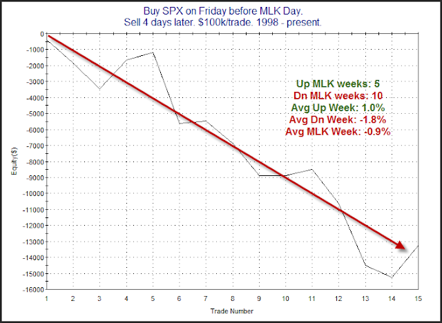 MLK week has exhibited a bearish tendency over the last 15 years. The market has been strong lately, but if it is going to pull back this upcoming week could be an opportune time for the bears.