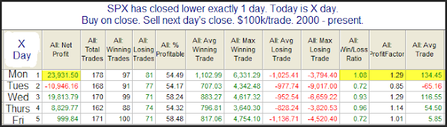 It’s been a while since I updated the Turnaround Tuesday study, so I thought I would do so today. The stats tables below all show results of buying at the close when SPX is down for a certain number of days and the exiting the following day. The results are broken out by day of the week. Note that the day listed is the trigger day – not the performance day. So the Monday trigger tracks Tuesday’s performance. Tuesday’s trigger tracks Wednesday’s performance…and so on.