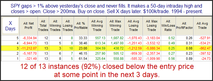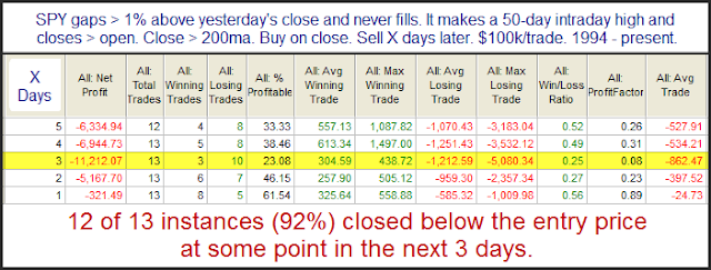 I am seeing a real mix of studies right now. The one below makes a short-term argument for the bears. It examines the unfilled gap pattern that emerged in the SPY on Friday. The study was last shown in the 10/28/11 subscriber letter. I ran it again this weekend.