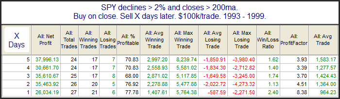 The SPY fell over 2% yesterday. Below is a simple study that looks at SPY performance follow all 2%+ drops while the market is above the 200ma.