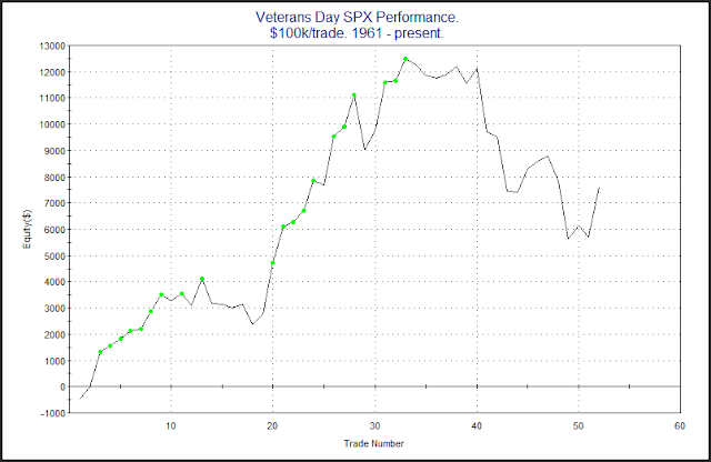 While for a good long while it appeared Veterans Day may provide an upside edge, the curve topped out in 1992. Since then it has been mostly lower. Happy Veterans Day and thanks to all veterans!