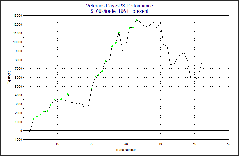 Veterans Day is one of the few US holidays when the bond market is closed and the stock market is open. Columbus Day is another. But while Columbus Day has exhibited some quantifiable edges, Veterans Day has not. (At least none that I have identified and feel confident about.) Veterans Day is celebrated on November 11th (or the closest weekday to November 11th) each year. For a brief period from 1971 – 1977 it was celebrated on the 4th Monday of October. Below is a profit curve that shows how Veterans Day has performed over the years.