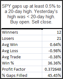 A Look At This Morning’s Gap Posted on October 14, 2009 by Rob Hanna Big gap up this morning on the heels of solid earnings. I looked at other times we saw a gap up to new highs in the SPY and found the following results: This would suggest a bit of a downside edge from open to close today.