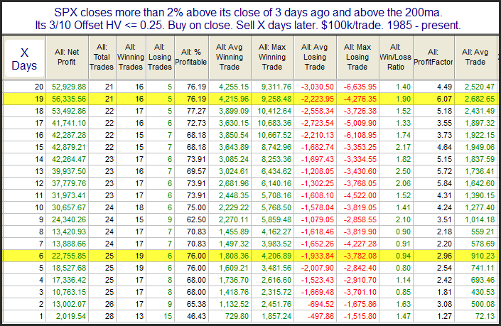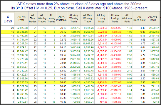 On Tuesday the 3/10 Offset HV for SPX came in at just 0.22. I found it particularly odd that the 3/10 Offset HV was so low considering we’ve seen a fairly strong move higher over the last three days. Wondering whether that meant downside risk is now greatly increased, I ran a study.