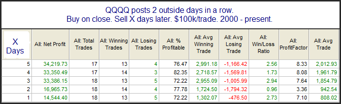 These appear to be quite positive implications. They also confirm the December study where I looked at back to back outside days in SPY.