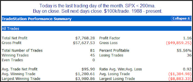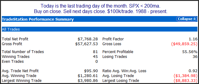 This first study shows results since 1988 of committing $100k per trade on the 1st of the month if the SPX is trading above its 200ma.