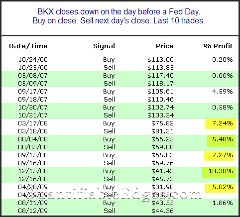 BKX Drops Ahead of the Fed Posted on December 16, 2009 by Rob Hanna The banks got hit hard on Tuesday with the BKX falling nearly 3%. Below are results of the last 10 times the BKX dropped on the day before a Fed Day. Gains of 5% or more are highlighted in yellow.