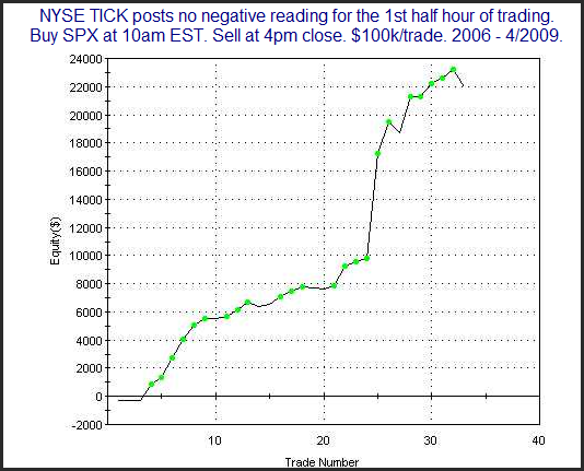 The study below shows how strong early TICK action (no negative TICK reading in 1st 30 minutes) suggested a strong upside edge for the rest of the day. The period studied is 2006 – 4/2009.