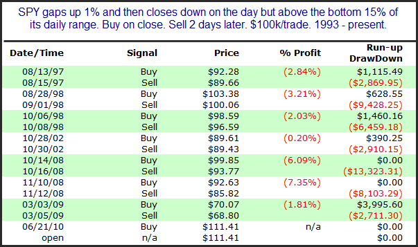 It’s quite rare for the market to 1) gap up large and then 2) close down on the day BUT 3) a good distance off its lows. Yesterday the SPY didn’t even close in the bottom 25% of its daily range. Even bounces much smaller than yesterday’s late day bounce can take some of the positive energy away from the next day. In last night’s Subscriber Letter I loosened the parameters a bit and still was presented with a rare but fairly compelling setup. Indications were bearish over the next few days, with 2 and 3-day exits both showing all 7 previous instances with negative returns. Below I show all trades using a 2-day exit.