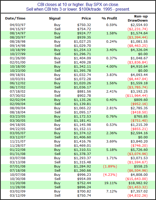 Yesterday’s huge selloff caused the CBI to spike up from 4 to 17. In the past I’ve discussed how a CBI of 10 or higher has typically been a good long signal. I’ve shown that a trading system that went long when the CBI hit 10 or higher and then sold only when it had dropped back to 3 or lower showed a very favorable edge. Below is an updated list of all instances since 1995.