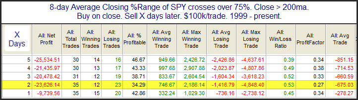 Note: To calculate the “8-day Average Closing % Range” I am simply measuring where in the daily range SPY closed each day. For instance if it traded at a low of $141.00 and a high of $142.00 and closed at $141.75, then it would have closed in the 75th percentile of the daily range. A close at $141.50 would have meant 50%.