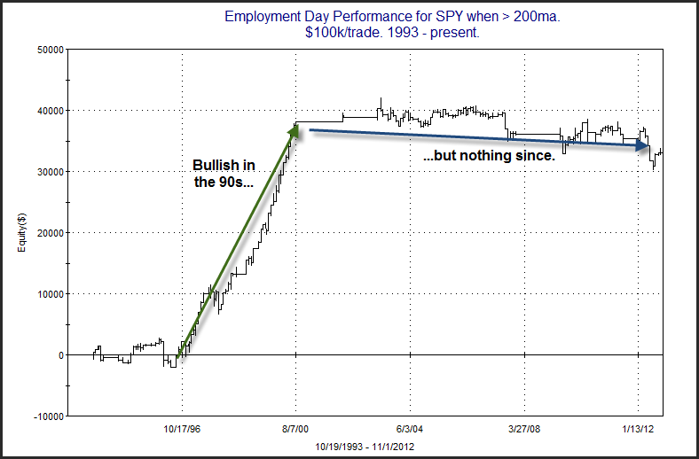 Employment days have an interesting history and they have contributed to some worthwhile studies over the years. By “Employment Day” I mean days that the Federal Employment Report will be released. This occurs once per month and is normally on the 1st Friday of the month. Below is a chart of SPY performance on Employment Days during bull market environments. Each trade was a fictional $100k.