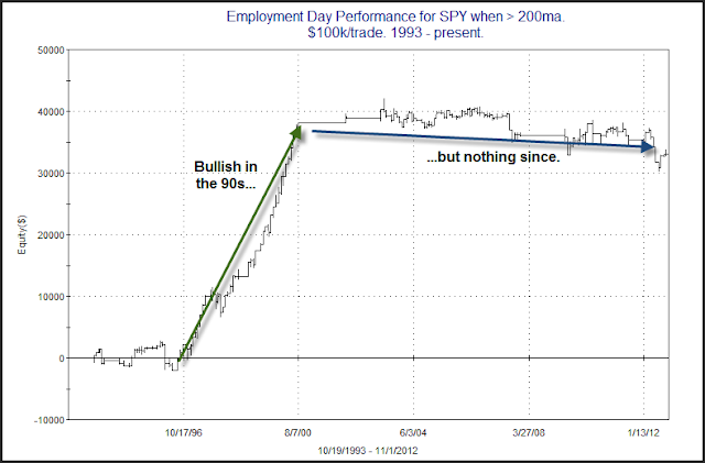 What I find so interesting about the chart is that for a long time Employment Days in uptrends showed a strong propensity for gains. But in 2000 this edge vanished. Since then there has been no apparent advantage – bullish or bearish. While it’s unusual to see such an abrupt change in market dynamics, it does serve as a nice reminder that such changes are always possible.