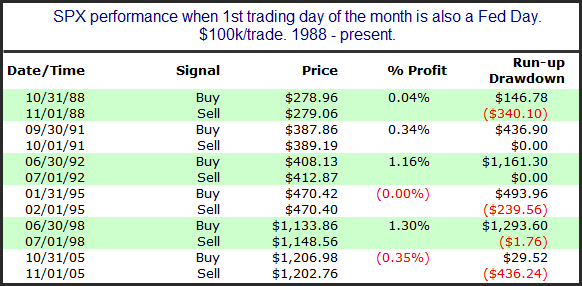 As I mentioned last night, Wednesday is a Fed Day. Fed Days have historically had a bullish inclination. Of course Wednesday is also the first trading day of August. I’ve documented numerous times that since the late 80s the first trading day of the month has had a bullish tendency. So I wondered how the market has performed on days that a Fed Day has coincided with the first trading day of month. There have only been six instances since the late 80s. I’ve listed them all below.