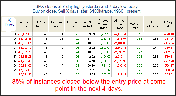 High To Low In 1 Day Revisited Posted on January 19, 2010 by Rob Hanna One study that popped up in the Quantifinder Friday night is from the 6/16/09 blog post. It looked at quick moves from a high to a low. I’ve updated that study below: Such sharp moves from a high level often see spillover in the following days.
