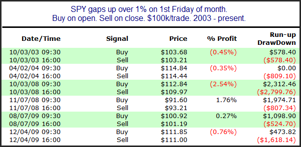 The employment report nornally comes out on the 1st Friday of the month. Today’s report is helping to trigger a large gap up in the SPY. I looked back at other times since 2003 where the SPY gapped up more than 1% on the first Friday of the month.