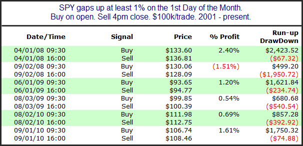Last night in his video “Gap Guy” Scott Andrews took some interesting looks at gaps that occured on the 1st day of the month. Of course since he posted it early he couldn’t have known we were about to get such a large gap up. Inspired by Scott I took a look at other 1% gaps that occured on the 1st day of the month. I’ve listed all instances below.