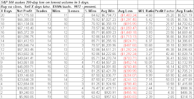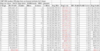Unfortunately when I went through some of those studies Monday night I realized something quirky was happening in Tradestation. I had run them using imported volume data that went back to 1992. I also ran them on the Tradestation volume data from 1992 – present. I did this to check and see that the sets were similar. Upon finding they were I removed the 1992 – present restriction and looked back from 1960 – present. When I did that for some reason the tests ran improperly and they continued to only look back as far as 1992. There’s good news and bad news associated with this. The bad news is that when looking back further the numbers aren’t quite as enticing. The good news is that with a larger data set I was able to examine 200-day lows as well.