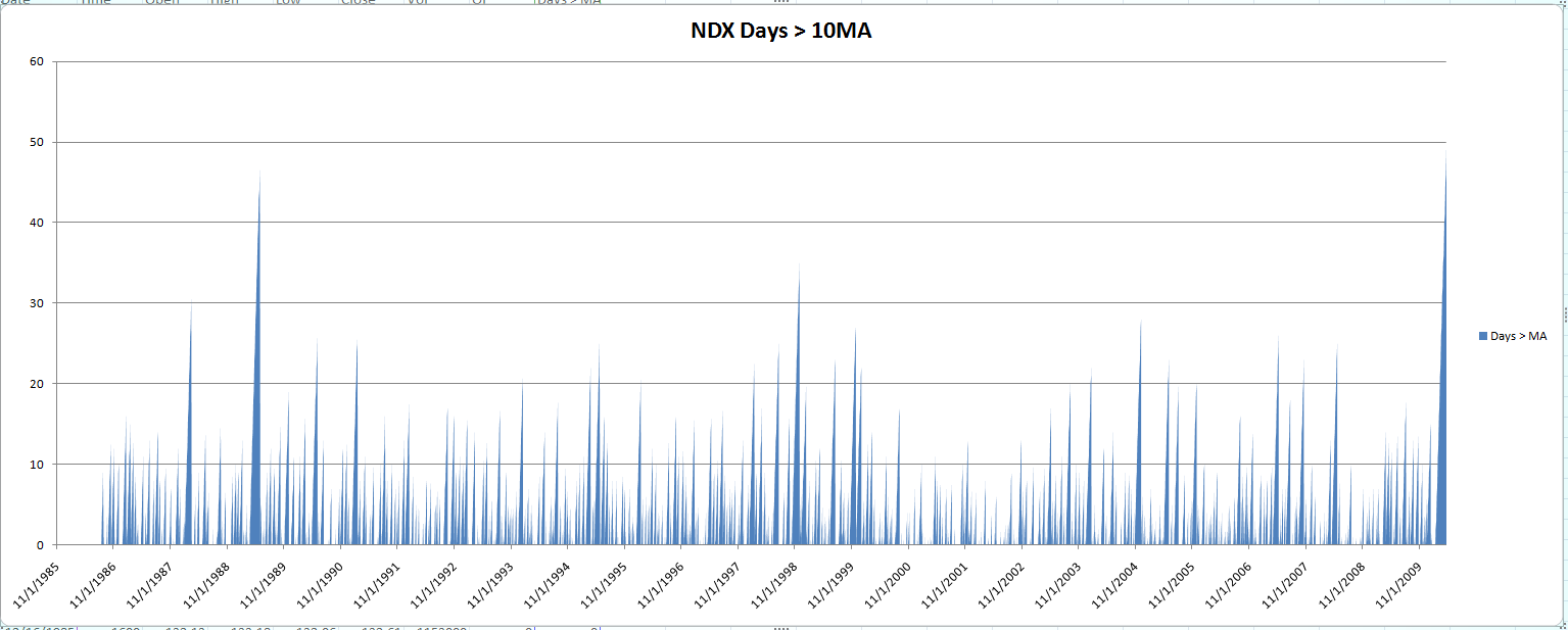 The NDX has now had a remarkable streak of 50 closes above the 10ma. That’s over 2 months without even a mild pullback. This is the longest streak since the index’s inception in 1986. Below is a chart that shows the number of days the NDX has spent above it 10ma at any point in time.