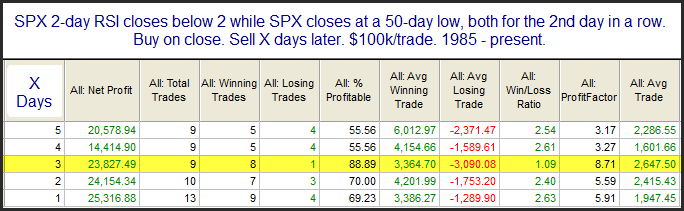Below is a study from last night’s Subscriber Letter. It looks at when happens when ths SPX has been oversold short-term (via RSI2) and intermediate-term (50-day low).