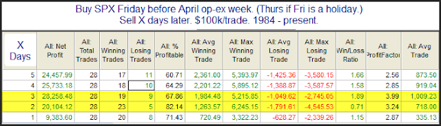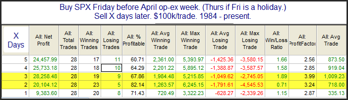 April expirations week has historically been very bullish. I showed this last year in the 4/11/11 blog post and have updated it below.