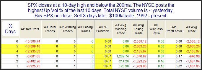 I’m seeing some evidence suggesting the market has quickly become overdone to the upside and is likely to pull back. Below is one study from last night’s subscriber letter that looks at other times the SPX made short-term highs on strong breadth but weak volume while in a long-term downtrend.