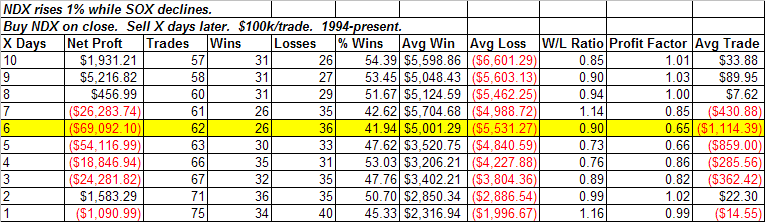 One bit of action I did find notable today was that the Nasdaq 100 gained over 1%, but the SOX closed lower on the day. It’s quite unusual for the NDX to put in such a strong performance without some help from the SOX. Historically this has had slightly bearish short-term implications for the NDX: