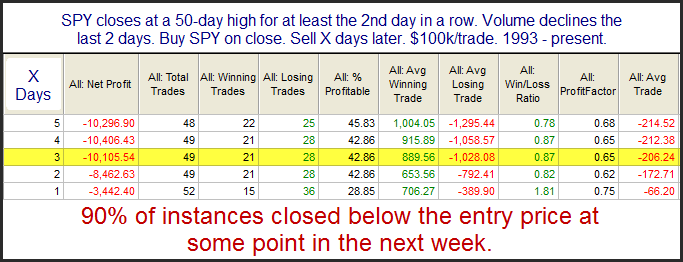 Declining volume at new highs can often lead to short-term difficulties. Below is a study related to SPY and SPY volume that I’ve shown a few times in the Subscriber Letter. It popped up in the Quantifinder again on Thursday.
