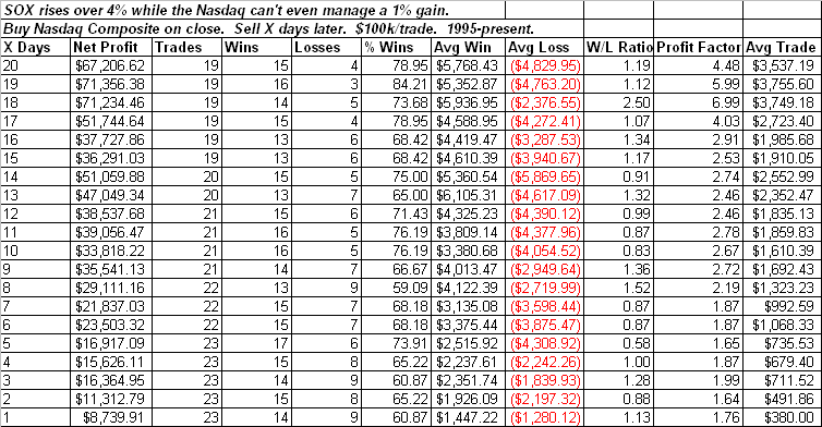 I’ve discussed in the past the fact that strong SOX action can often be a good harbinger for the the market. While both the S&P 500 and the Nasdaq failed to gain even 1% on Friday, the SOX rose more than 4%. It’s especially unusual for the SOX to post such strong gains without bringing the Nasdaq composite along with it. It has provided a nicely bullish expectation for the Nasdaq going forward.