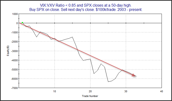 Examining the VIX:VXV ratio is a concept I first heard from Bill Luby at VIX & More. The VIX is a measure of short-term (30-day) volatility expectation and the VXV measures intermediate-term (93 day) volatility expectations. The ratio right now is quite low – a little below 0.85. This means that short-term volatility expectations are substantially below intermediate-term volatility expectations. When readings this low coincide with 50-day SPX highs it suggests a possible bearish edge for the next day. This was demonstrated in a study that the Quantifinder identified yesterday afternoon. It last appeared in the 1/13/11 subscriber letter. I updated it last night. Below is an equity curve showing a 1-day holding period for this setup.