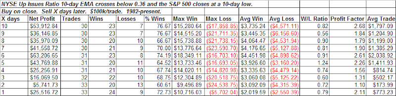 One indicator I watch is the 10-period EMA of Up Issues / (Up Issues + Down Issues). When it gets extremely low it normally signals the market is oversold and likely to bounce. On Monday it crossed below 0.36. Below is a study showing how the market has performed other times the indicator has dropped this low.