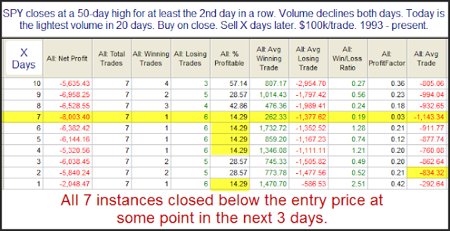 Low volume at a new high can often be concerning, whether it be NYSE volume or SPY volume. In last night’s subscriber letter I looked at a couple of volume-related studies with moderately bearish inclinations. I then combined them to see what would occur. The study below shows the result of the combination.