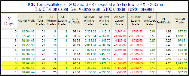 The study below considers the extremely low reading in the TICK TomOscillator. The TICK TomOscillator is an indicator that uses recent closing TICK values to determine buying and selling interest at the end of the day. It was developed by Tom McClellan. I’ve done some work with it and the name I use is one I made up. For those who would like to learn more about the TICK TomOscillator, the link below is a good place to start.