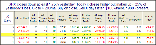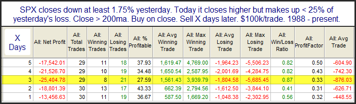 The first day of a bounce from an oversold condition can often provide strong hints about how the next several days are likely to perform. Weak bounces like we saw on Friday tend to have a much lower success rate over the following days. The study below appeared in Friday’s Quantifinder. It exemplifies this concept.